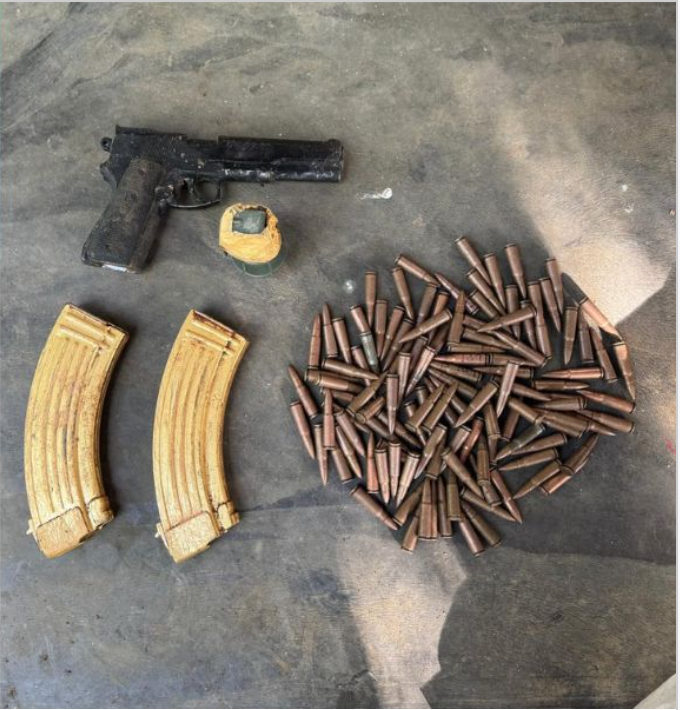 Police recovered two gold-colored T56 magazines, 115 rounds of T56 ammunition, a hand grenade, and a damaged 9mm pistol from a house in Weerodagama. The items had been buried earlier this month on the property of a woman whose husband, an employee of the Ceylon Electricity Board, has also been arrested.